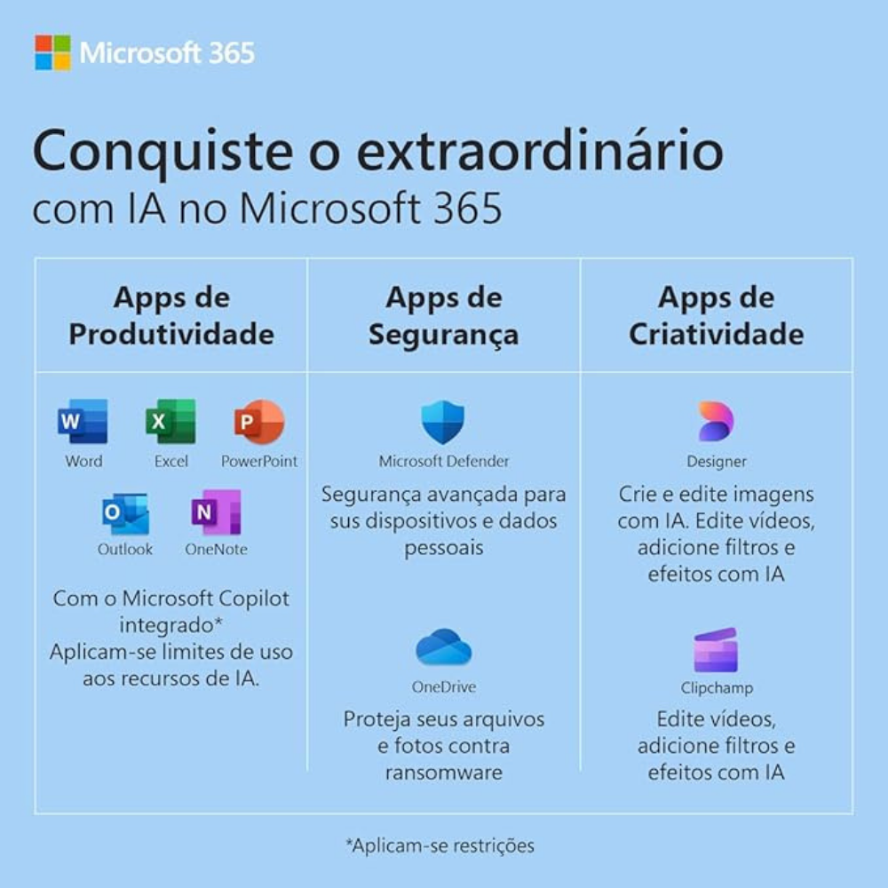 - Compatibilidade com Múltiplas Plataformas: O Microsoft 365 e o Antivírus são compatíveis com PCs Windows, Macs, smartphones e tablets.