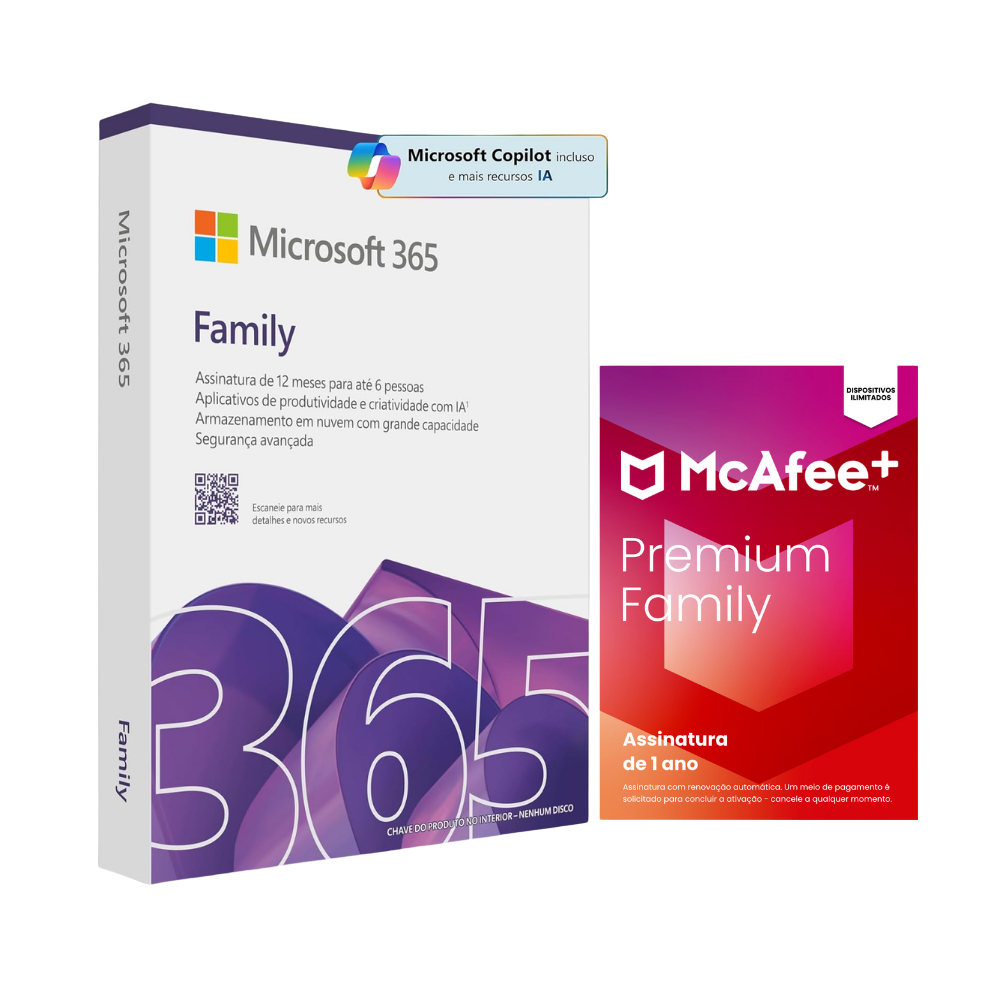 O Microsoft 365 Family + Antivírus McAfee+ Premium Family combina as principais ferramentas de produtividade com segurança digital de alto nível, oferecendo mais praticidade, organização e proteção para o dia a dia. Ideal para famílias que buscam desempenho e tranquilidade em múltiplos dispositivos, o pacote reúne aplicativos essenciais e um antivírus completo para manter seus dados sempre seguros.