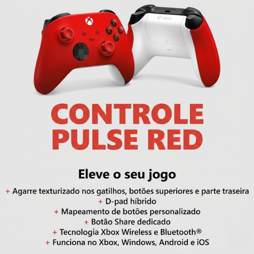 Experimente desempenho, estilo e precisão com o Controle Sem Fio Xbox Pulse Red. Com acabamento em vermelho vibrante e detalhes contrastantes, ele entrega personalidade marcante sem abrir mão da performance.