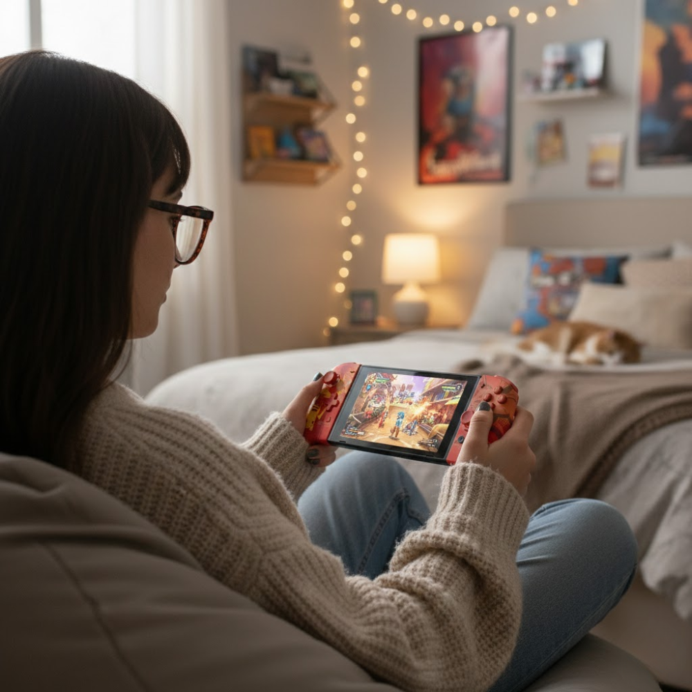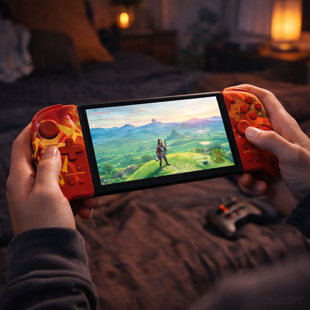 Ele substitui os Joy-Cons, oferecendo uma pegada maior, mais confortável e com botões de tamanho padrão.
