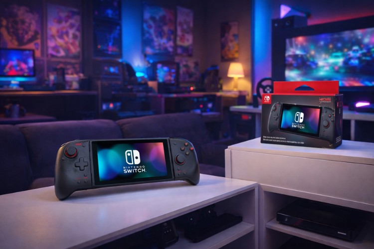 Ele substitui os Joy-Cons, oferecendo uma pegada maior, mais confortável e com botões de tamanho padrão.