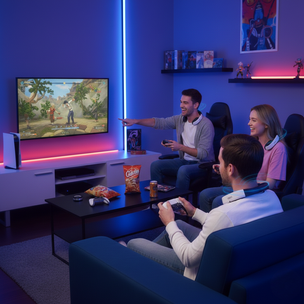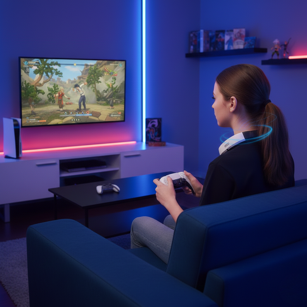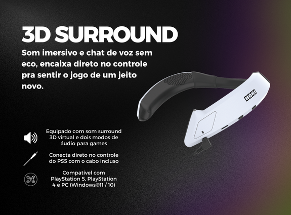 A HORI apresenta uma solução revolucionária de áudio para jogos: o fone de ouvido de pescoço 3D Surround Gaming Neckset, projetado para PlayStation 5. O 3D Surround Gaming Neckset para PlayStation 5 é um fone de ouvido que se encaixa confortavelmente nos ombros durante o jogo. Ele possui som surround virtual e dois modos de áudio para jogos: Modo Reforço de Graves e Modo FPS. Alterne para o Modo Reforço de Graves para um áudio rico e equilibrado ou para o Modo FPS para amplificar até os sons mais sutis e detectar rapidamente a localização de inimigos e outros sons do jogo. Converse sobre estratégias com seus companheiros pelo chat de áudio do jogo com voz nítida e sem eco, graças ao nosso recurso de cancelamento de eco. Basta conectar o 3D Surround Gaming Neckset para PlayStation 5 ao seu controle DualSense para desfrutar de uma nova experiência de áudio. *Requer carregamento – o cabo USB-C incluso serve.